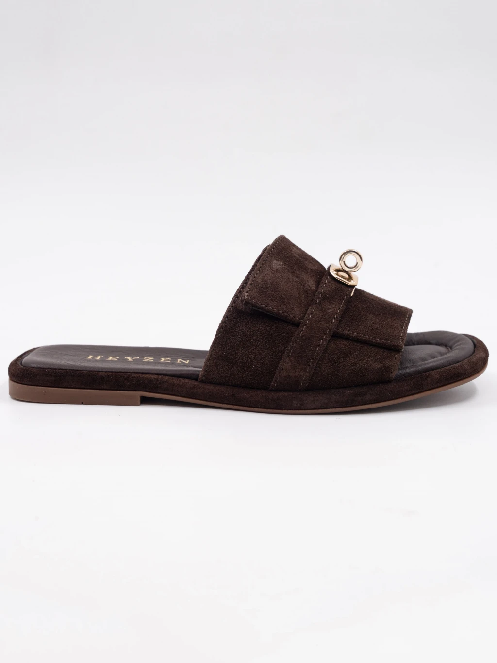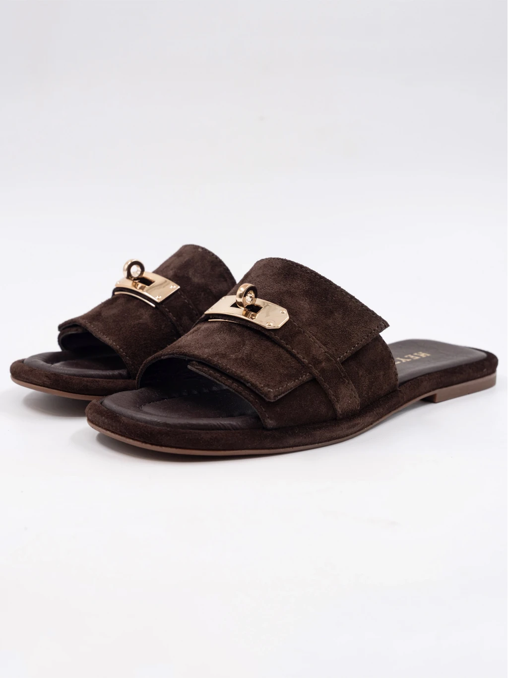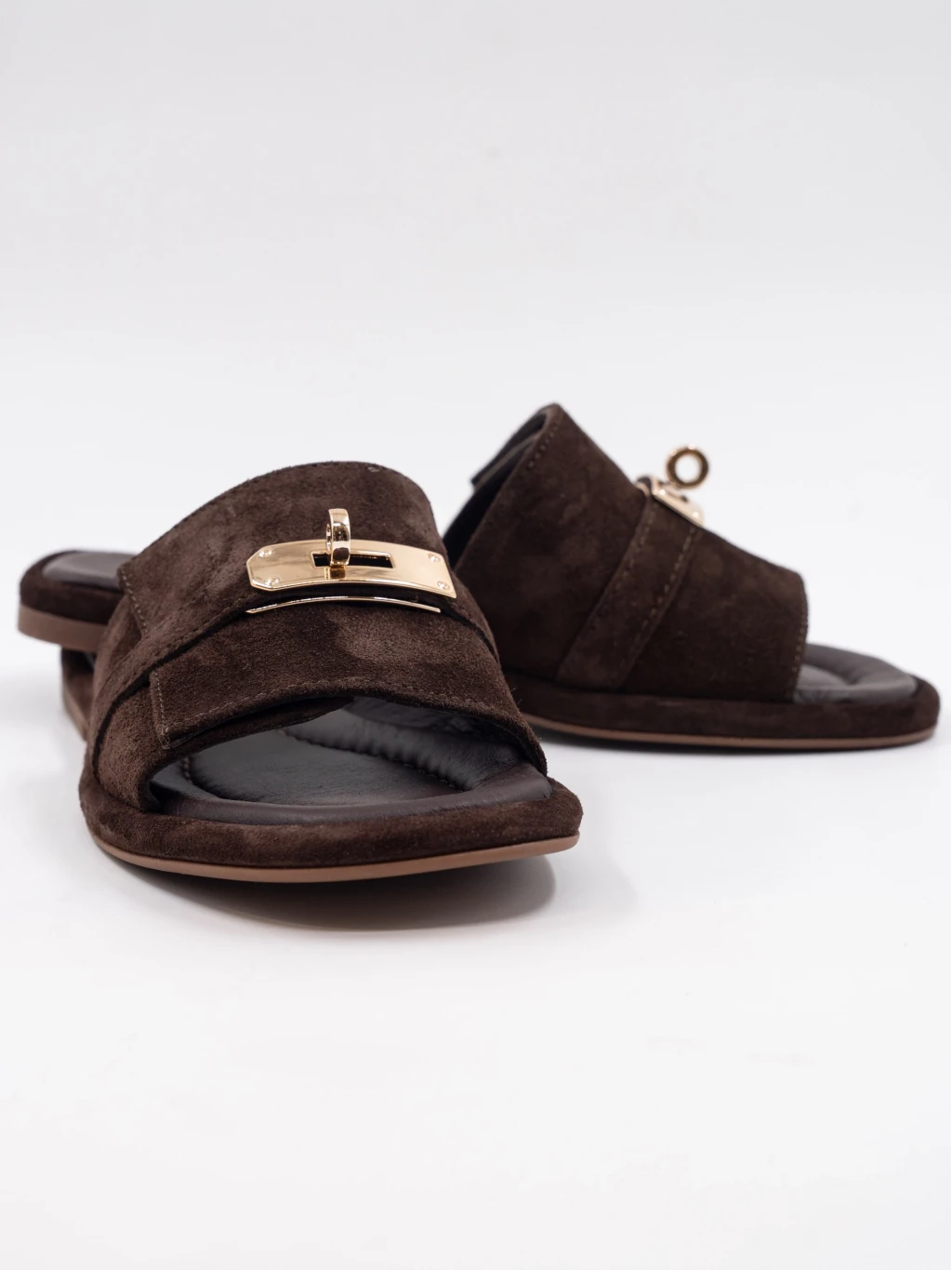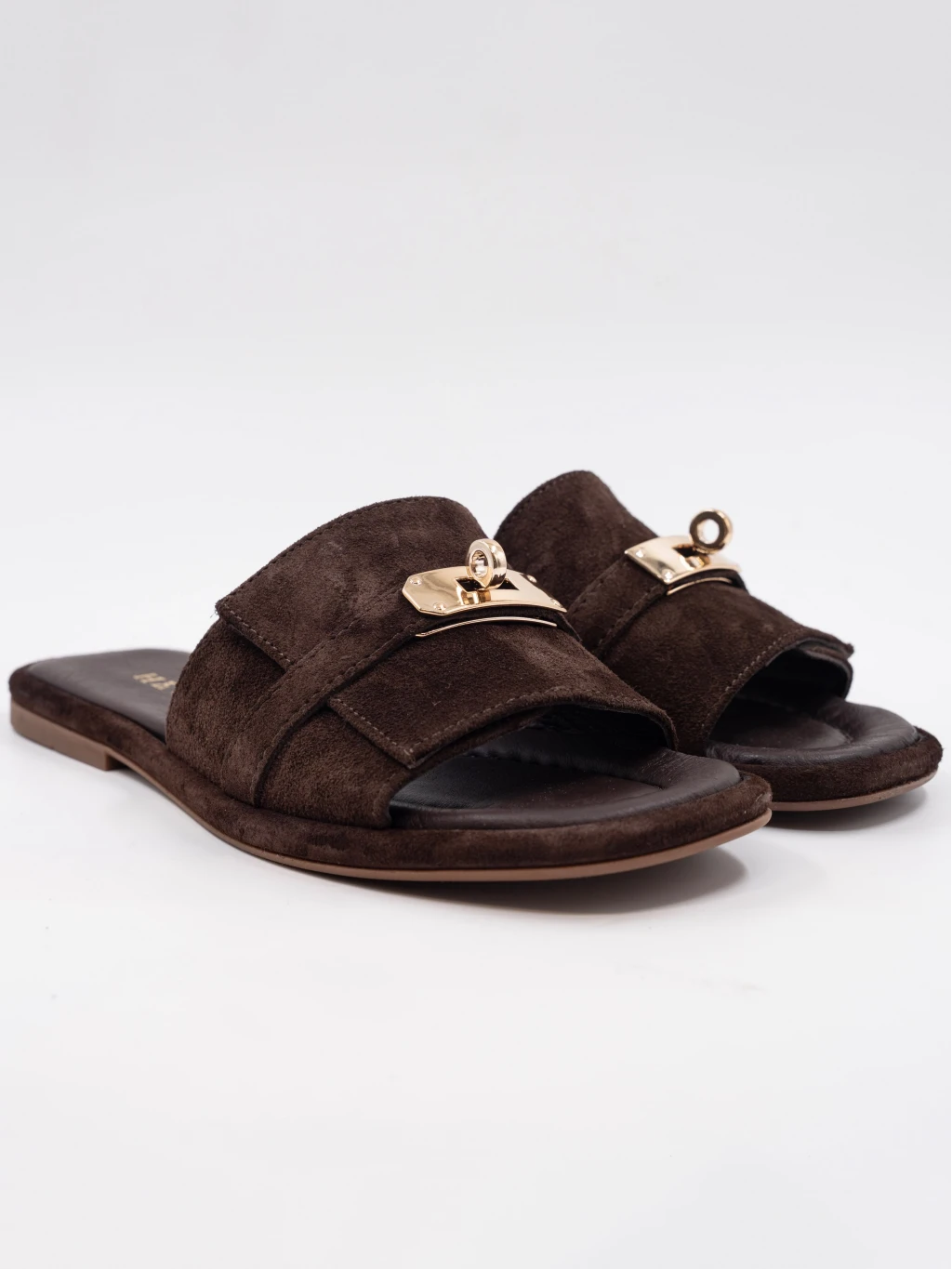 Gold Toka Detay Süet Deri Terlik Kahve